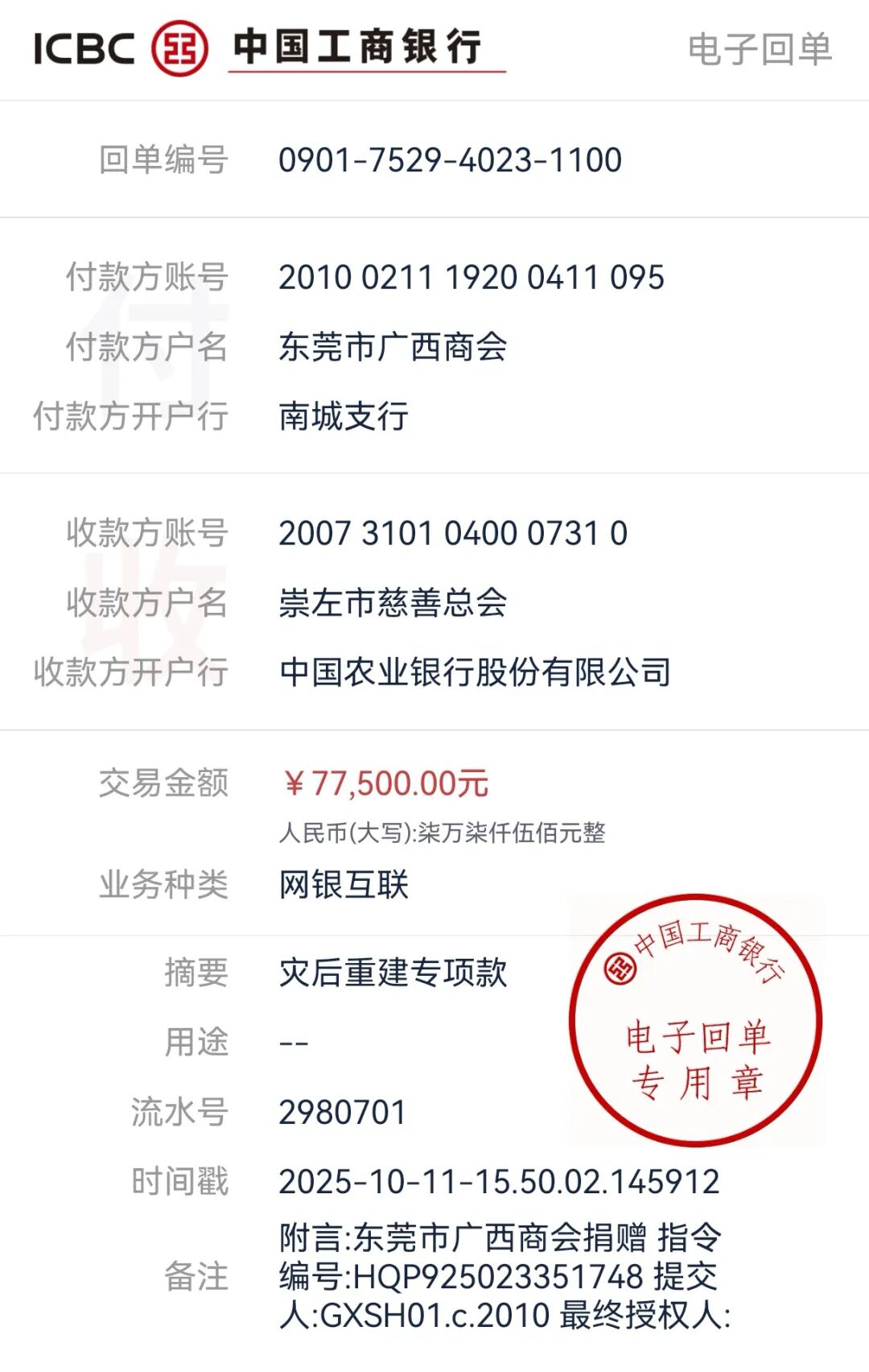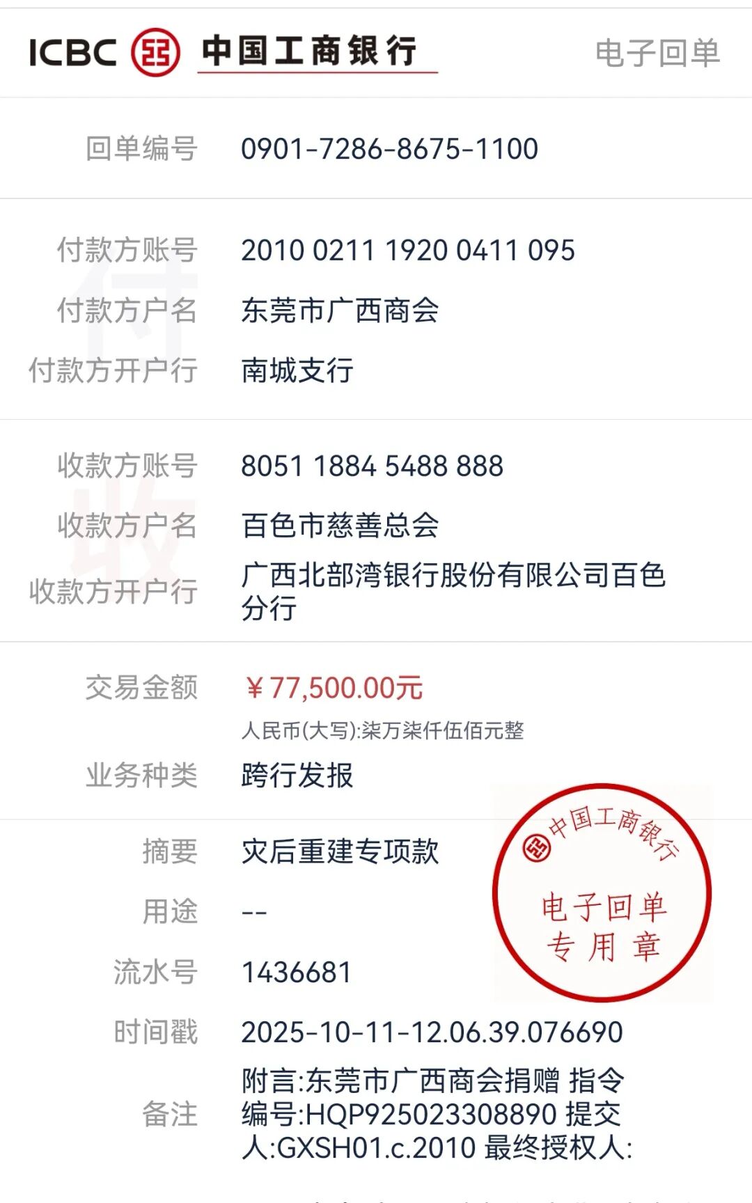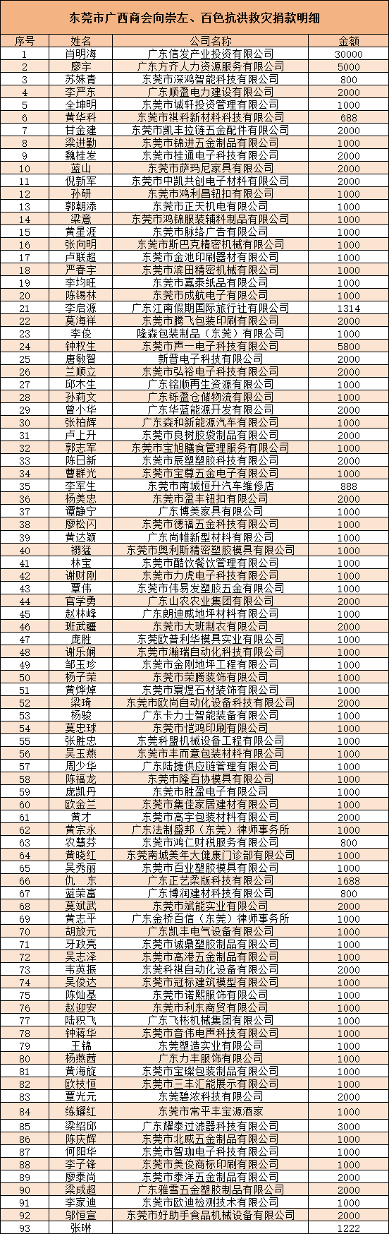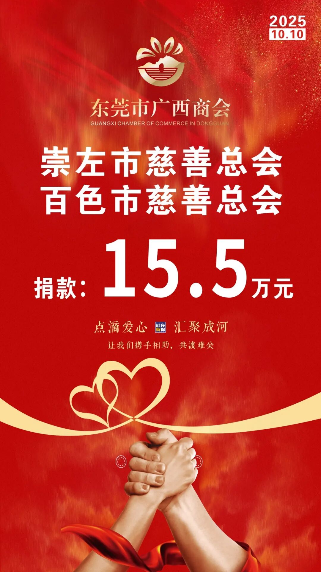 倡议一经发出,广大会员积极响应,慷慨解囊,以实际行动诠释“一方有难,八方支援”的深情厚谊。共向崇左市慈善总会和百色市慈善总会捐款15.5万元。每一笔捐款,皆承载着对家乡父老的牵挂与祝福。 截至目前,商会已将所募善款均分汇至崇左市慈善总会与百色市慈善总会,由当地统一采购急需物资,确保爱心精准送达。 东莞市广西商会向所有奉献爱心的会员单位致以诚挚感谢!是你们的善举,让涓涓细流汇成江河,点滴温暖聚为希望。桂商有情,大爱无疆,我们与家乡同心同行,共迎曙光!